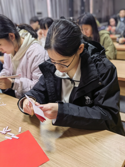 “大家知道吗?双喜字的发明者竟是王安石!”活动一开场,冯老师便以一段引人入胜的历史故事吸引了在场所有人的目光。据可靠文献记载,王安石大婚当日恰逢金榜题名,于是他挥毫泼墨,创作了连体的“囍”字,从此这个字成为了婚庆场合中不可或缺的符号。在现场展示的清代婚书剪纸上,喜字与莲花、石榴巧妙地融合,象征着“喜结连理、多子多福”。冯老师在讲解剪纸艺术时,强调“剪喜字要‘笔断意连’,就像婚姻需要包容与韧性。”“想要剪出完美对称的喜字,折纸是关键!”一位员工在尝试过程中屡屡错位,冯老师耐心地指导他:“折纸如同练字,每一折都需精确对准中线,力度要恰到好处。”经过多次练习,原本不甚规整的折痕逐渐变得整齐划一,教室里随之响起了阵阵“成功了”的欢呼声。